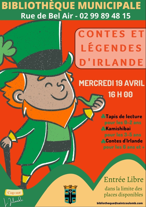 Des contes et légendes d’Irlande seront proposés aux enfants de plus de 6 ans le premier mercredi des vacances scolaires de printemps, à 16 h 00.